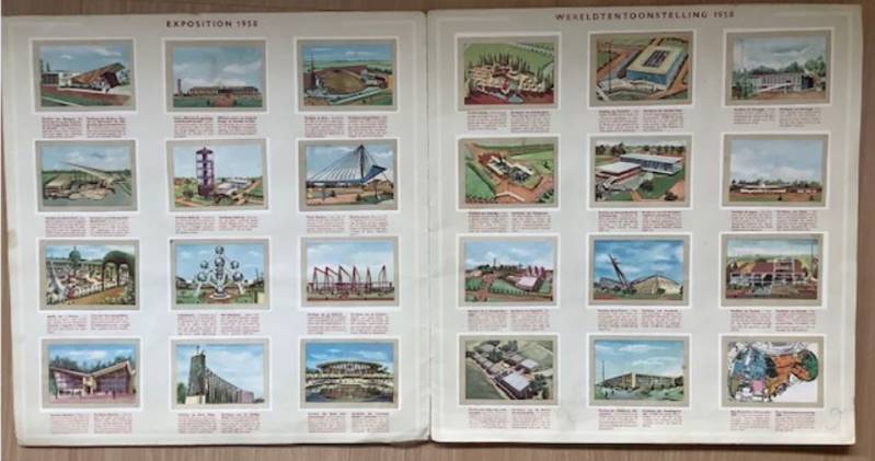 In het album uit 1959 zie je de prentjes met de verschillende paviljoenen van de Expo 58.